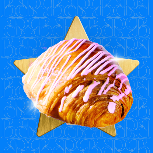 A combination of dark chocolate and strawberry flavored white chocolate rolled inside a Butterboy pain au chocolat, drizzled with more strawberry white chocolate