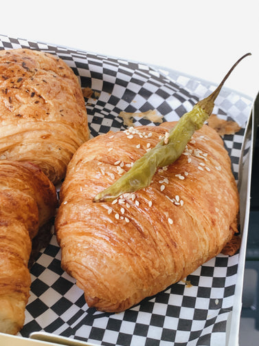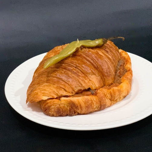 Butterboy croissant with shredded beef chunks in cheese caldereta sauce, topped with sesame seeds and a pickled pepper.